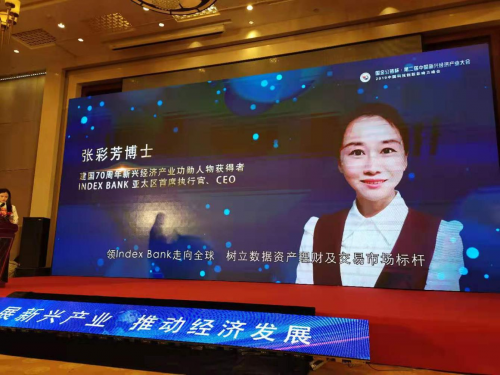 Index Bank指数银行亚太区CEO张彩芳博士引领Index Bank走向全球,树立数据资产理财及交易市场标杆,荣获中国建国70周年新兴经济产业功勋人物。