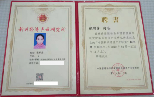 图:张彩芳博士受聘为中国新兴经济产业联盟副主席(身份证号以及证书编号不在网络公布,故进行遮挡处理)