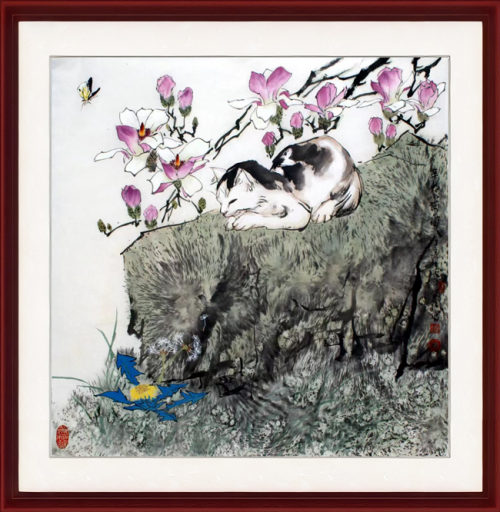 上个世纪九十年代,当时我居住在圆明园。我本人喜欢画猫,所以当时家里养了几只猫,其中有一只猫叫“小熊“与我特别亲近,当我坐在沙发上时,它总要卧在我的腿上。当我站着作画时,它也要跳在我肩膀上看我画画……