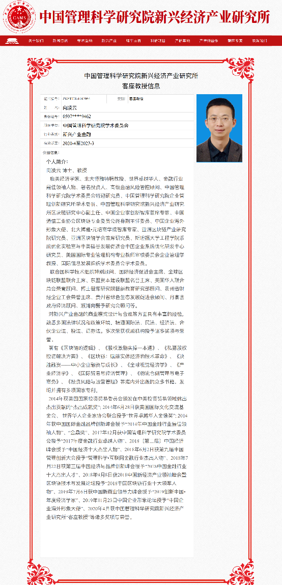 据了解,向凌云同志于2013年受聘担任中国管理科学研究院学术委员特邀研究员、中国管理科学研究院企业管理创新研究所学术委员、中国管理科学研究院新兴经济产业研究所区块链研究中心副主任、中国企业家创新智库首席专家、中国通信工业协会区块链专业委员会终身副主任委员、中国企业海外形象大使、北大博雅·元培商学院智库专家、亚洲区块链产业研究院研究员、亚洲区块链学会首席研究员、斯坦福大学工程学院系统优化实验室与中美硅谷发展促进会中国企业系统优化研发中心研究员、美国国际专业管理机构专业教师审核委员会企业管理学教授、国际信息发展组织学术委员会学术委员、北大博雅特聘教授以来,在推动管理创新、新兴产业金融研究等方面做出了突出的贡献。2020年4月29日,经中国管理科学研究院有关部门推荐提名,聘请向凌云同志担任中国管理科学研究院新兴经济产业研究所客座教授。