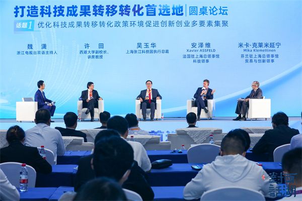 法国驻上海总领事馆科技领事Xavier ASSFELD(安泽维)、芬兰驻上海总领馆-贸易与创新领事米卡·克莱米延宁(Mika Klemettinen)、西湖大学副校长许田、上海张江科技园执行总裁吴玉华等专家在多个维度,多个角度展开了有关“优化科技成果转移转化政策环境,促进创新创业多要素集聚”的讨论。